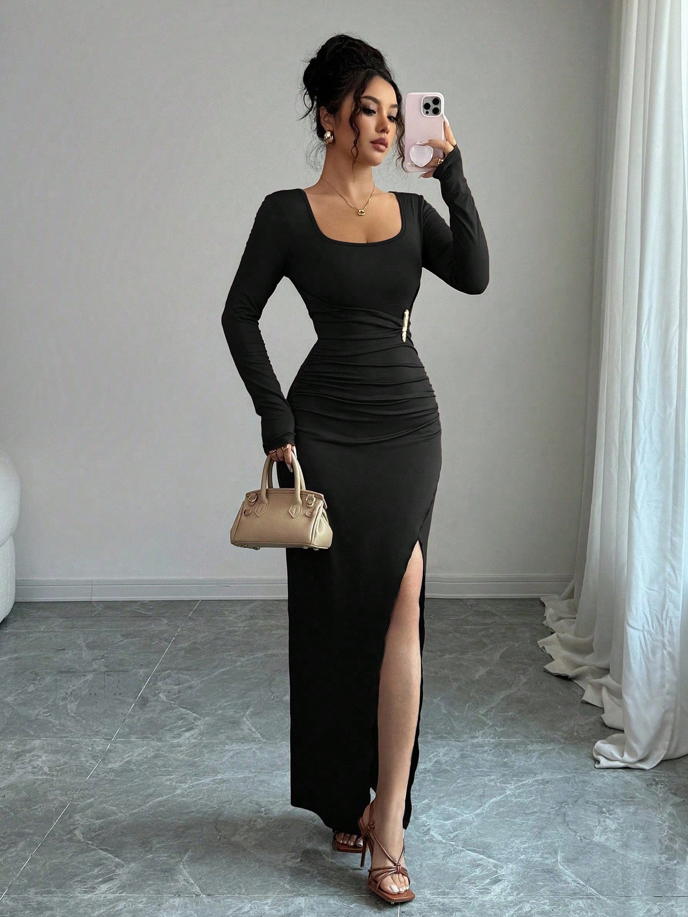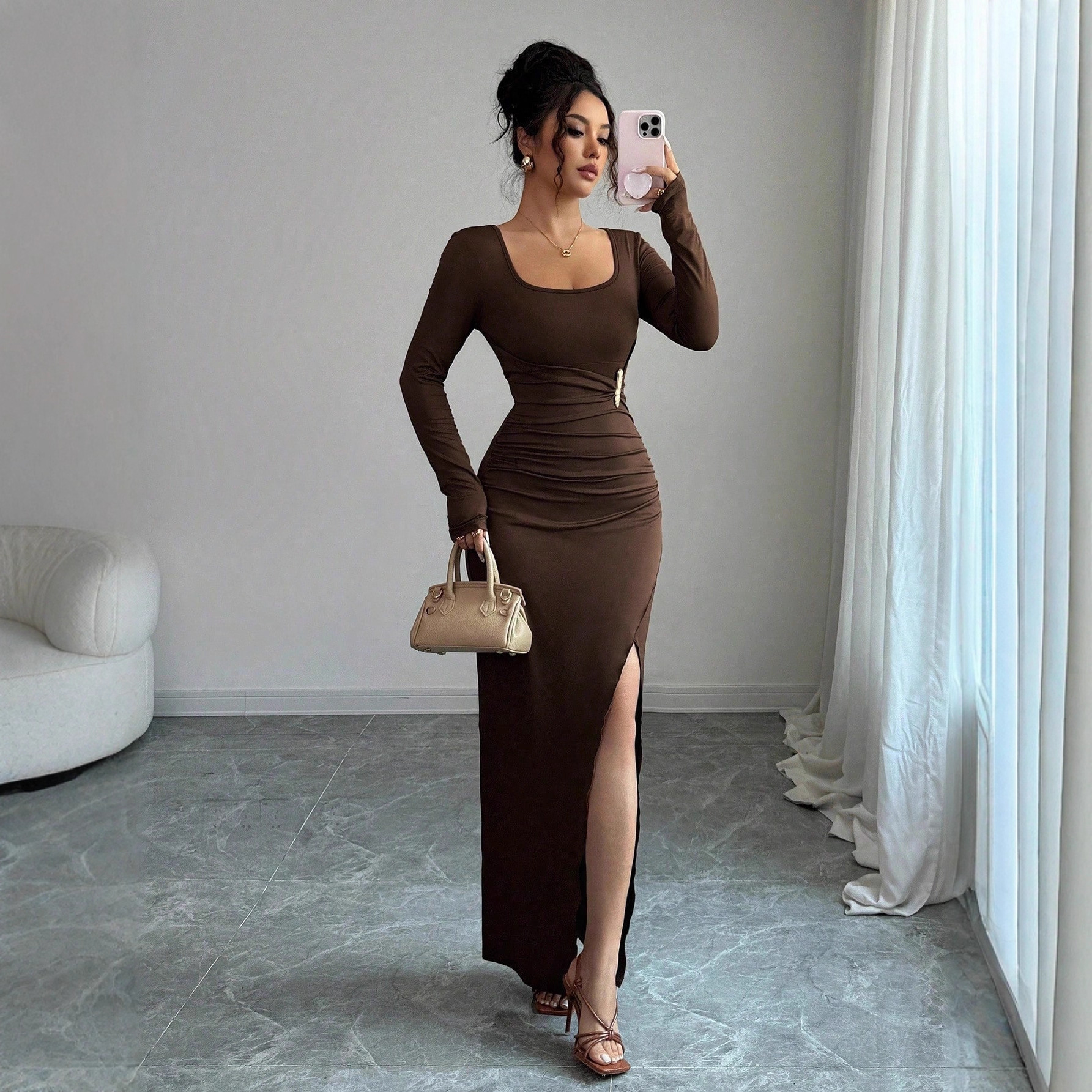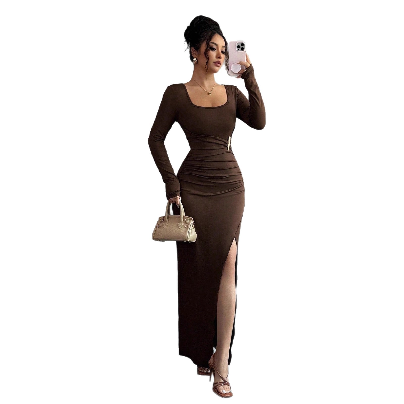 Be the first to review “Collar solid color slim fit knitted long sleeve slit dress”