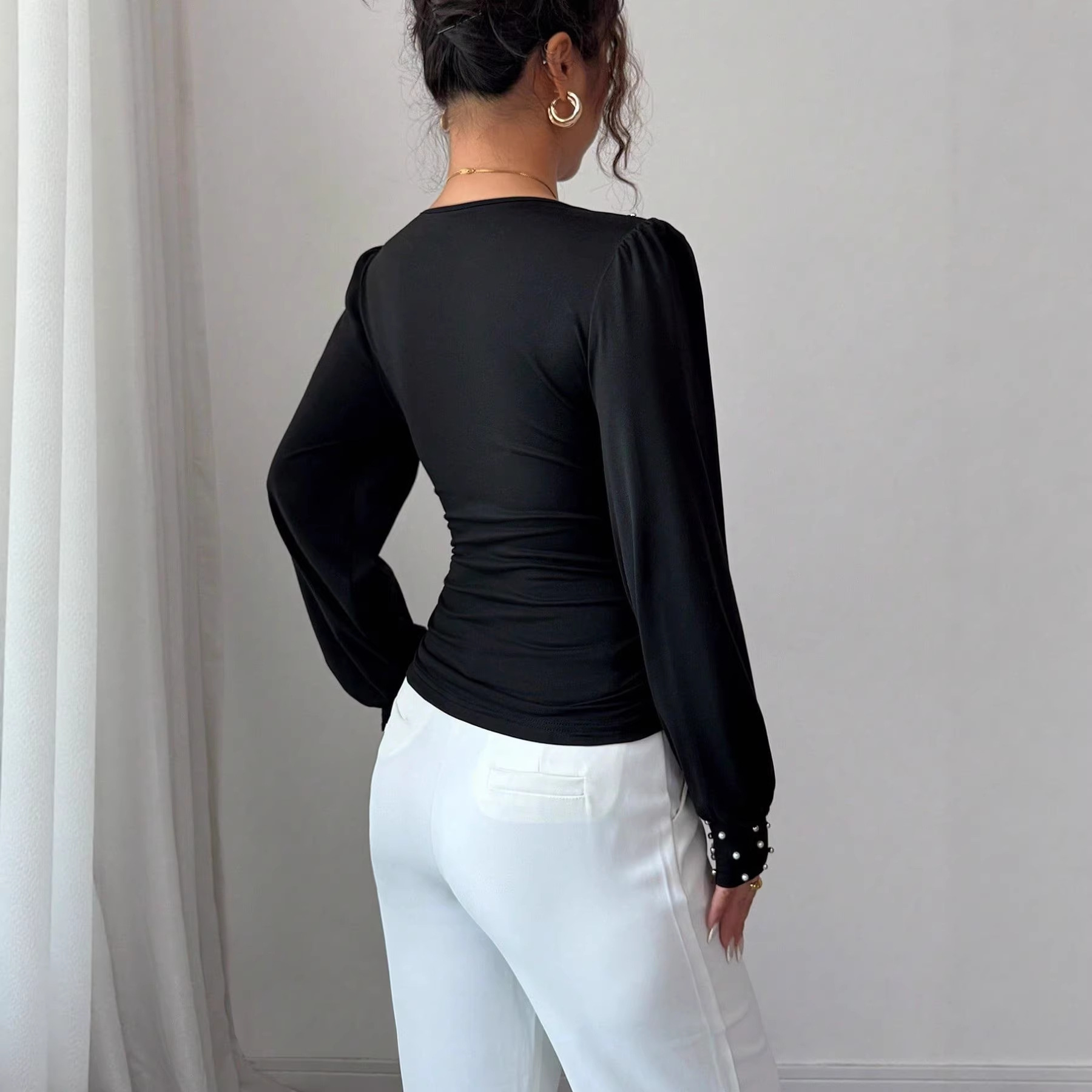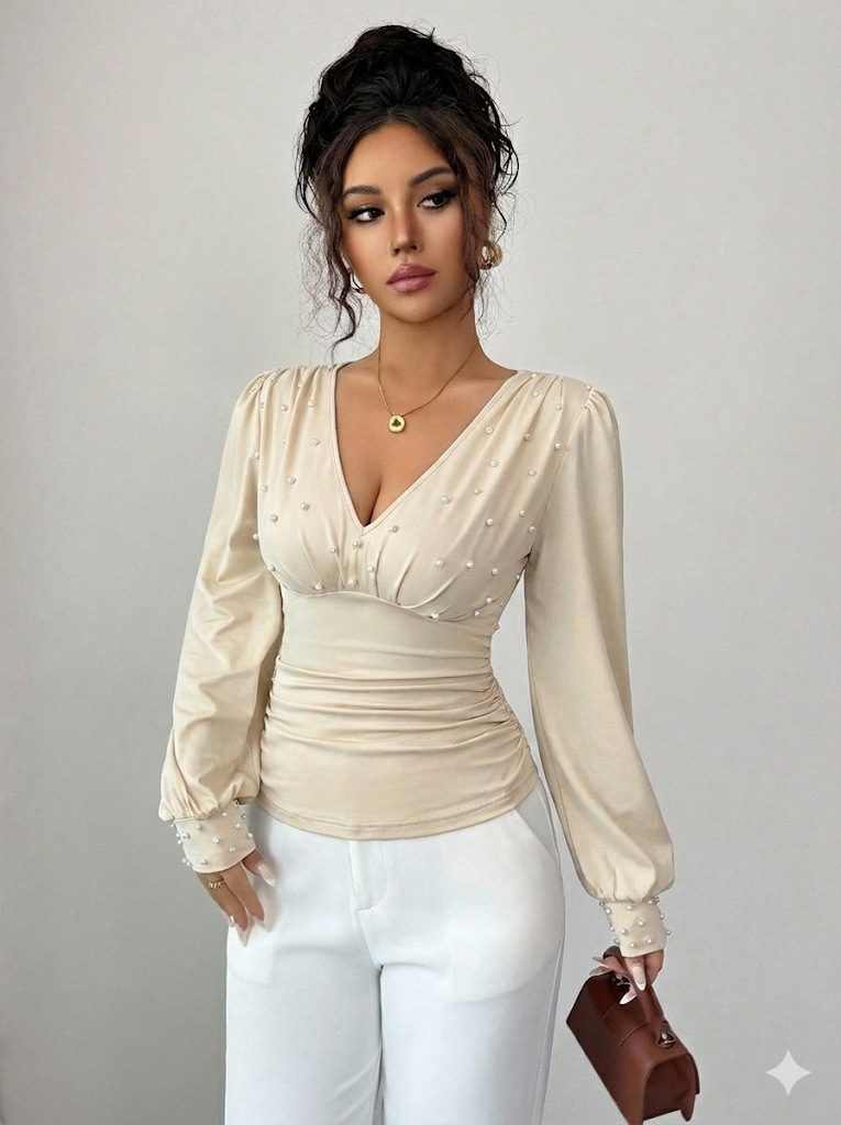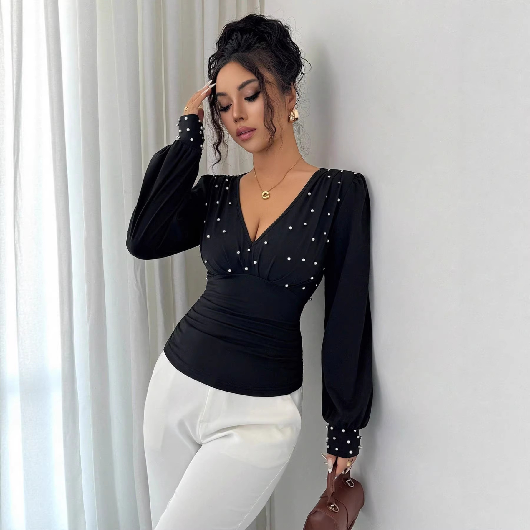 Be the first to review “Fashionable handmade pearl solid color long sleeve slim shirt for women with collar”