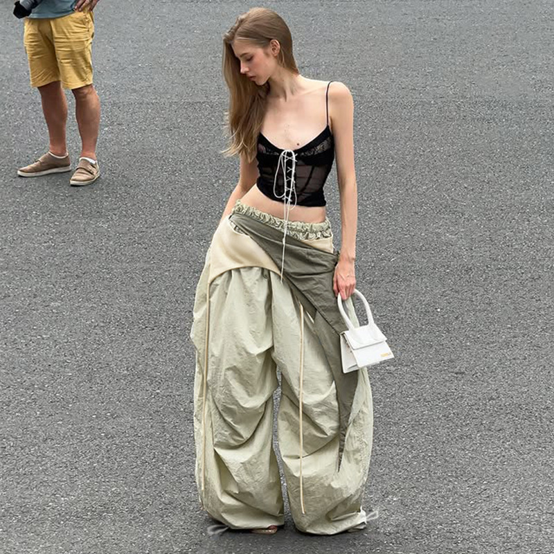 Low Price # Hot Girl Lace-Up Design Pleated Ribbon Overalls Street Loose Lazy Pants