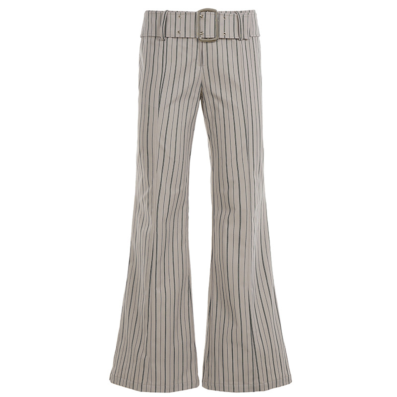Retro striped contrasting color metal buckle design woven trousers, versatile casual low-waisted hot girl trousers with slight bootcut