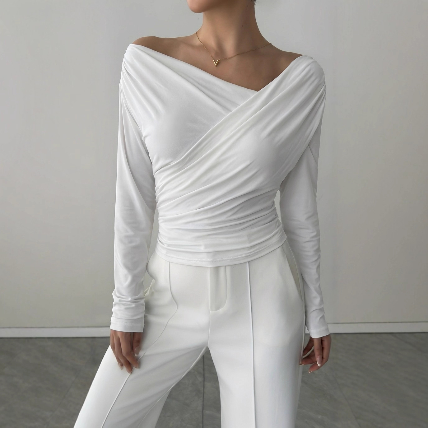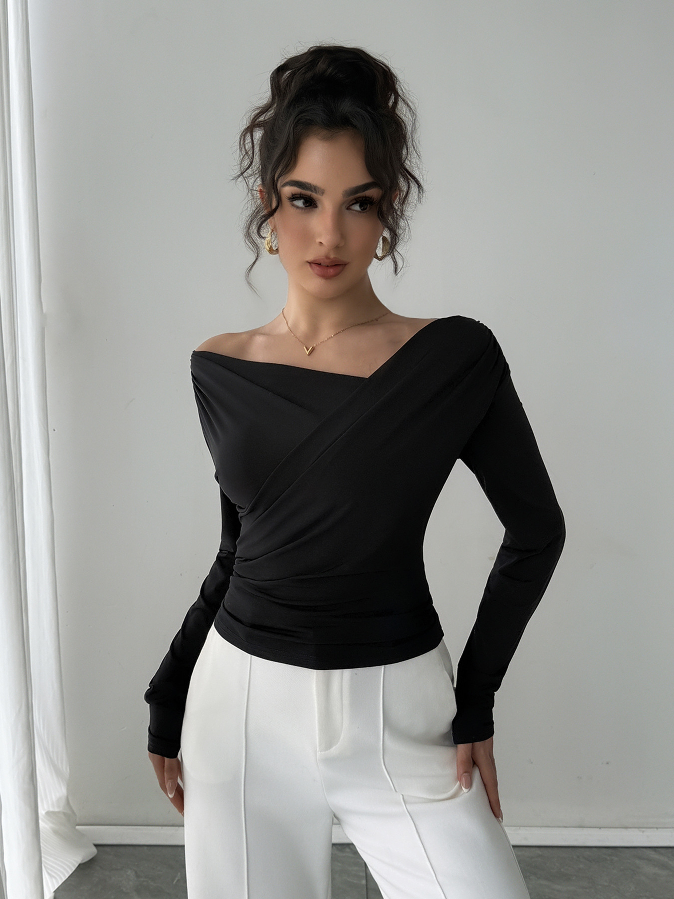 Solid color fashionable off-shoulder collar slim long-sleeved versatile commuter top