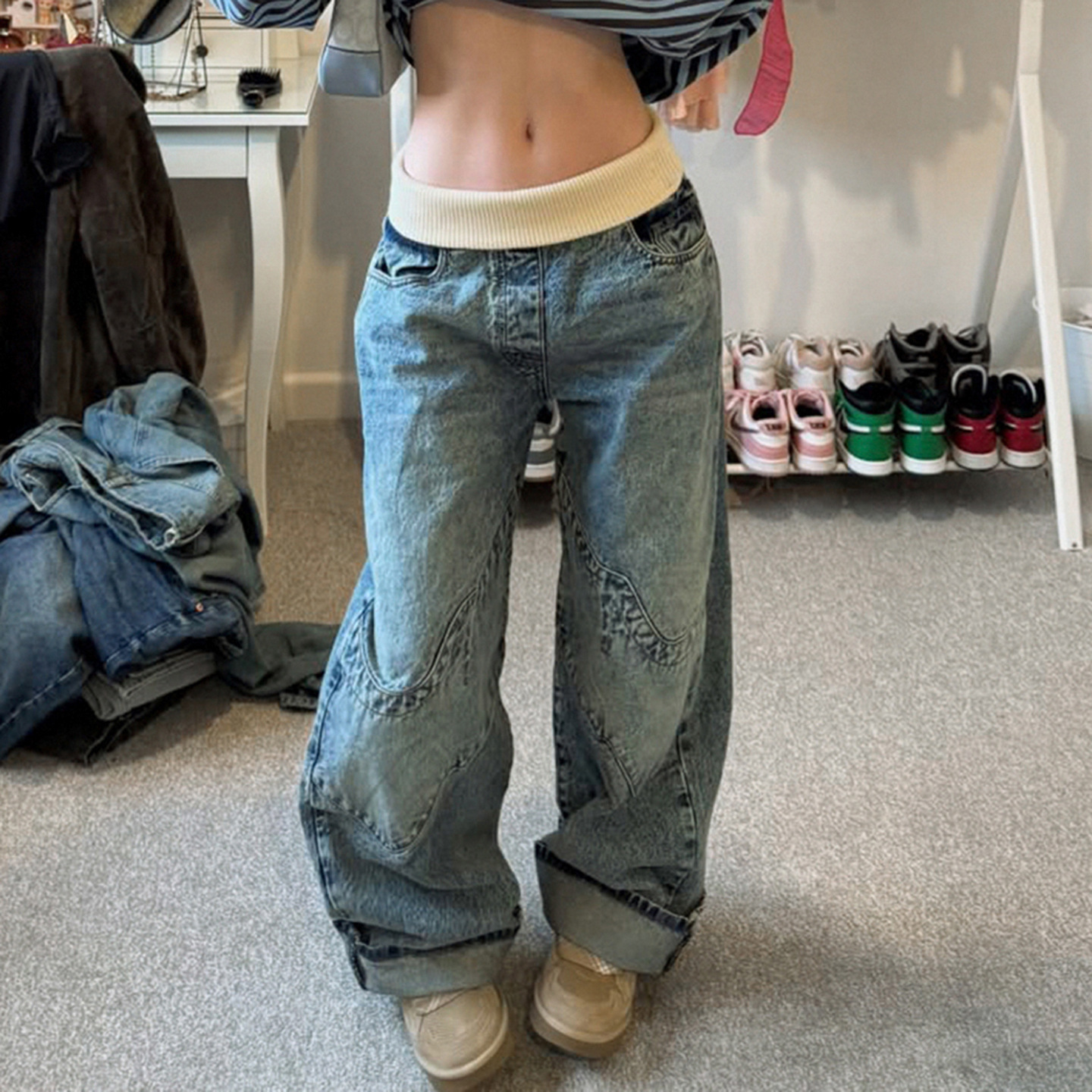 Be the first to review “Street contrasting threaded stitching washed and distressed casual loose jeans retro hip-hop style wide-leg pants for women”