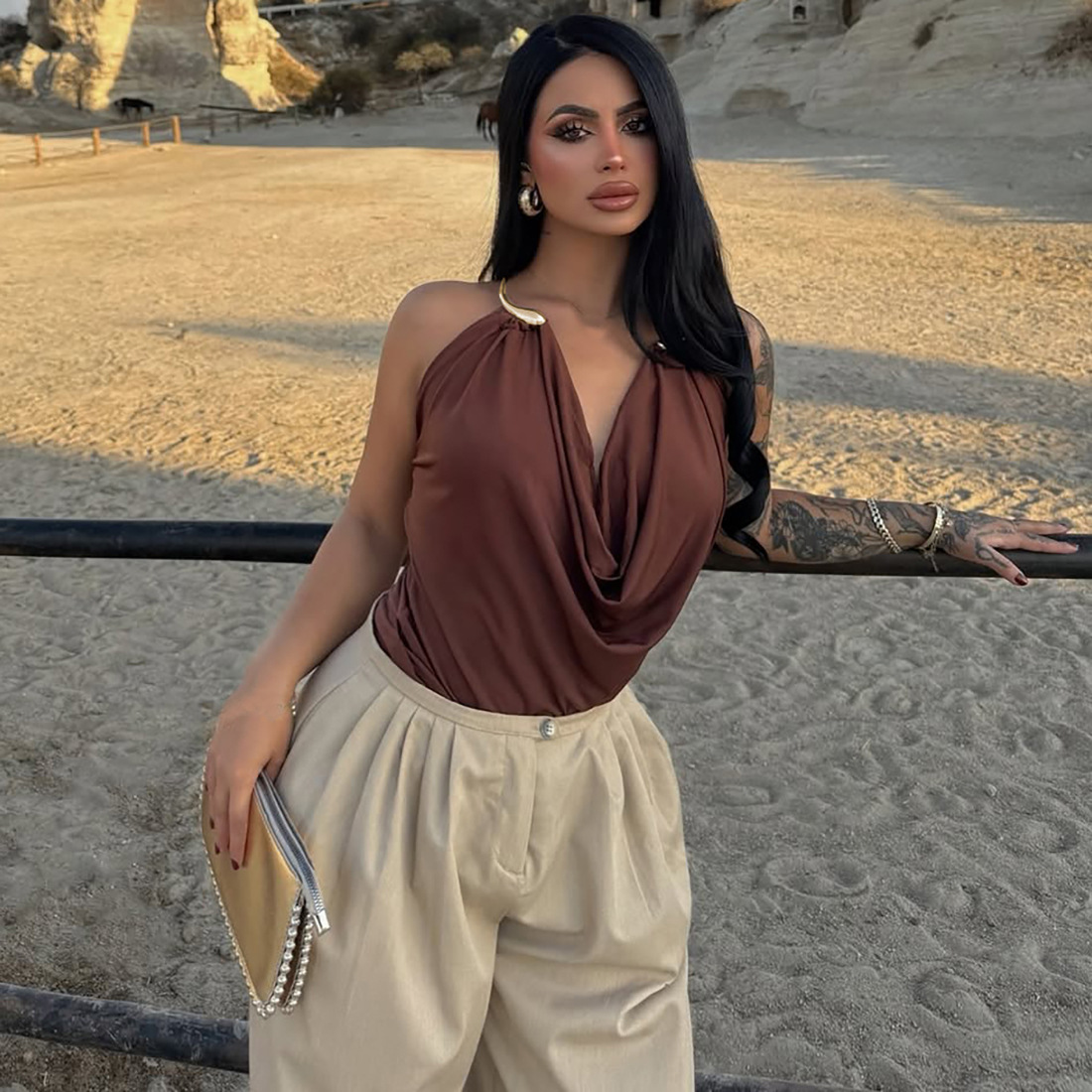 Women’s Fashionable Sexy Metal Halter Pile Collar Backless Solid Color Vest