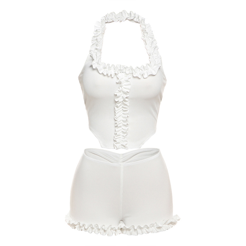 Women’s Solid Color Sexy Ruffled Halter Vest Slim Fit Bottoming Shorts Two-piece Set