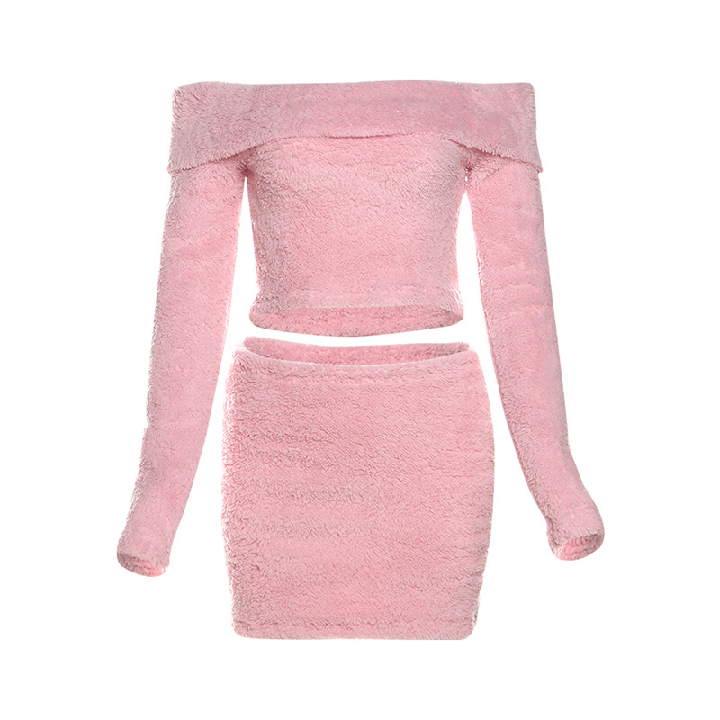 Women’s style one-line collar short-haired fur shirt women’s hip-hugging skirt casual suit